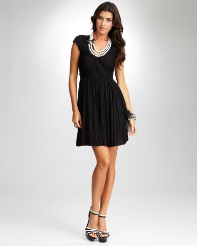 Exquisite twisted and knotted detail at bust, girly A-line design, and capped sleeves make this bebe dress an effortlessly chic must-have. Offers stretchy and soft wear that moves with you. Elevate it with metallic pumps and layered pearl strands. Center back to hem: 32.5".